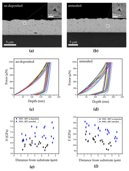 Finally, the mechanical properties of the films were investigated by nanoindentation over cross-sections. A matrix of nanoindentations was made for each film, as shown in Figure 4a,b. At an applied load of 1 mN, both films exhibited good ductility as no cracks were observed around the indentations in either film. Zhuo et al. showed for BaTiO3 that a threshold load of 200 g (~2 N) is required to see the difference in the crack resistance between the as-deposited and annealed films, with the as-deposited films performing better and not forming cracks around the indentations [12]. The crack resistance of the films, which is not characteristic of conventionally sintered ceramics [32], is probably related to the high density of the grain boundaries, which makes it easy for the grains to slide against each other during indentation, as well as to other defects in the films, such as dislocations [13].