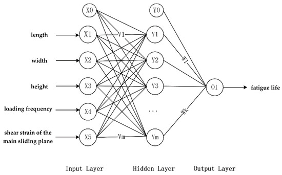 When multiple neurons are added to the model, an artificial neural network is formed. The model connection principle diagram is shown in Figure 2. The input vector is X = (X1, X2, …, X5) T, where X1, X2, X3, X4 and X5 are the length, width, height and loading frequency and shear strain of the main slip plane of microscale single-crystal copper. The hidden layer output vector is Y = (Y1, Y2, …, Ym) T. O1 is the output vector representing the fatigue life. V = (V1, V2, …, Vm) T is the weight matrix between the input layer and the hidden layer. W = (W1, W2, …, Wk) T is the weight matrix between the hidden layer and the output layer. X0 is the threshold set from the input layer to the hidden layer. Y0 is the threshold set from the hidden layer to the output layer.