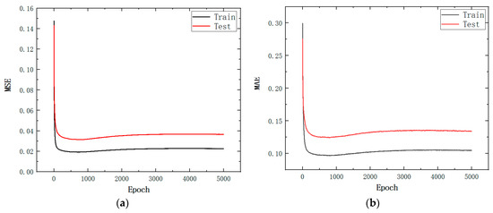 The change in mean square error and absolute value error in the training process are shown in Figure 4. From the mean square error function curve, it can be seen that when the number of iterations was from 0 to 400 steps, the mean square error function value of the training set decreased from 0.148 to 0.02, the mean square error function value of the test set decreased from 0.143 to 0.03, the absolute value error function value of the training set decreased from 0.300 to 0.08, and the mean square error function value of the test set decreased from 0.255 to 0.125; in addition, the decrease speed was very fast. At this time, the parameter iteration was coarsely adjusted with the gradient decrease. During the training process from 400 steps to 3000 steps, the mean square error and absolute value error of the test set and the training set increased slightly, but the increase was not obvious. At this time, the parameter iteration was fine-tuned with the gradient descent. In the training process of 3000 steps to 5000 steps, the mean square error and absolute value error of the test set and the training set tended to be stable, and there was no obvious fluctuation.