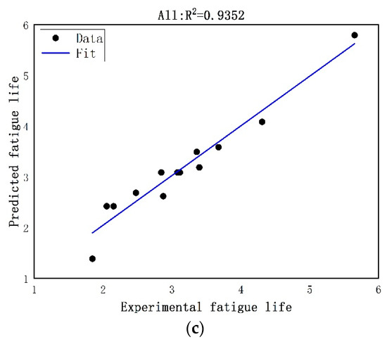 The prediction regression diagram shows a comparison of the predicted output results during the training process with the experimental objectives of the artificial neural network. Ideally, the output is the same as the objective of the artificial neural network. The slope of the regression diagram should be 1, the intercept should be 0, and the correlation coefficient of the ideal fitting is 1. The regression plots for the model predicting fatigue life are shown in Figure 5. Figure 5a shows the regression diagram of the training set. The slope of the line is 1.00122, the intercept is 0.07105, and the correlation coefficient R2 reaches 0.94212. Figure 5b shows the regression diagram of the test set. The slope of the line is 0.94831, the intercept is 0.02139, and the correlation coefficient R2 reaches 0.93271. Figure 5c shows the regression diagram of all sets. The slope of the line is 0.97967, the intercept is 0.08886, and the correlation coefficient R2 reaches 0.9352. The fitting line and correlation of training set and test set are very close to 1. This indicates that the predicted fatigue life is similar to the experimental fatigue life.
