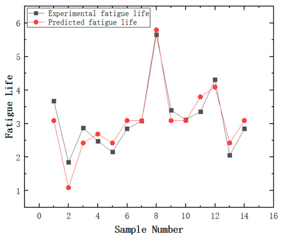 The experimental value and the predicted value of the fatigue life of the microscale single-crystal copper are shown in Figure 6. The experimental value and the predicted value are highly coincident, which reflects the degree of model training and has good generalization ability, indicating that the artificial neural network model has high accuracy for fatigue life prediction.