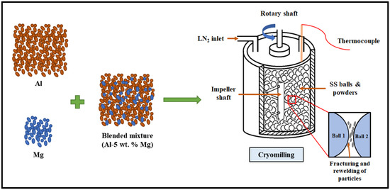 Schematic diagram of the experimental method showing the blending of powders and the cryomilling process.
