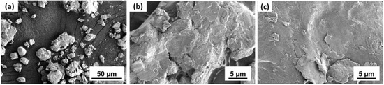 Another critical observation derived from cryomilled powders is that the shearing and cold welding occurring during the cryomilling process are functions of the cryomilling time. Figure 4b shows the surface features of Al-5 wt.% Mg powder particles cryomilled for 8 h. The surface reveals shearing marks and cold-welded fragments of the cryomilled powders. However, for Al-5 wt.% Mg powder cryomilled for 2 h, much fewer shearing marks and cold-welded fragments can be seen compared with 8 h cryomilled powders, as shown in Figure 4c. This observation is obvious yet essential because the repeated shearing and fracturing create a lot of strain energy in the grains. These highly strained grains help reduce the crystallite size of the powders. Therefore, the crystallite size decreases with the increase in cryomilling time up to a certain limit, beyond which there is a minor to insignificant change in crystallite size due to the dominance of the agglomeration phenomenon [44].