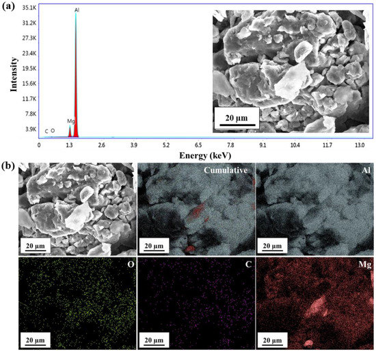 The particle morphology studies revealed the surface and textural features of the cryomilled particles. Further, EDX investigations were also conducted using SEM on cryomilled powders to understand their elemental composition. Figure 5a shows the SEM-EDX plot for Al-5 wt.% Mg powder particles cryomilled for 8 h. The plot shows the characteristic elemental peaks for Al and Mg, confirming the presence of Mg in individual particles. The absence of any other major elemental peak also confirms no contamination of the metal powders during or after the cryomilling process. Figure 5b shows the EDX area mapping for an Al-5 wt.% Mg powder particle. The figure shows the presence of trace amounts of oxygen all over the particle surface, indicating minimal surface oxidation. The presence of Mg all over the powder particle confirms the presence of Mg in a representative milled particle, reassuring the cryomilling process’s efficiency in mixing the powders.