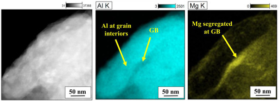 Table 1 shows the EDX elemental evaluation for 2, 4, 6, and 8 h cryomilled Al-5 wt.% Mg powder samples using SEM and TEM. The results suggest that the added Mg powders are uniformly mixed with the pure Al and present at the required concentration of around 5% in each cryomilled agglomerated particle, despite the variation in cryomilling durations. The results obtained using EDX for 40–50 µm size particles for all the test samples in SEM were mainly in line with the EDX conducted using TEM for a single particle. Figure 6 shows the TEM-EDX elemental mapping of the Al and Mg in the 8 h cryomilled Al-5 wt.% Mg powder particles. It can be observed that Al is uniformly distributed over the interior of the grain, whereas the maximum concentration of Mg is present at the grain boundaries. This preferential segregation of the Mg dopant at the grain boundaries occurs to stabilize the high-energy grain boundaries thermodynamically. Once the Mg sits at the grain boundaries, the overall energy of the grain boundaries is neutralized, forming a much more stable NC structure [45].