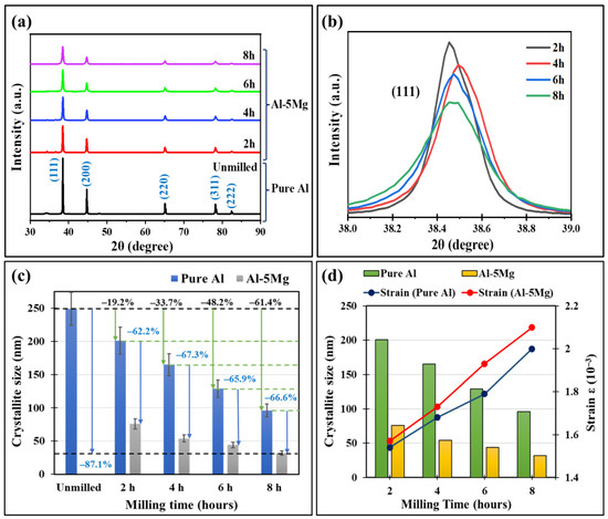 XRD results showing the effect of increasing cryomilling duration on (a) XRD plots and (b) peak broadening of Al-5Mg powders. The plots show the changes in (c) crystallite sizes and (d) strains with the increasing cryomilling duration for Al and Al-5Mg powders.