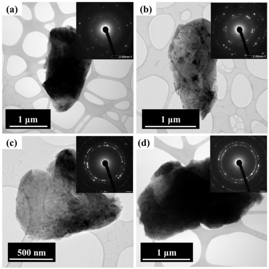 The Al-5 wt.% Mg samples were also analyzed using the SADP technique in TEM to determine the effect of the cryomilling duration on the polycrystalline nature of the Al-5 wt.% Mg powders. Figure 9a–d shows the bright-field TEM image for Al-5 wt.% Mg powders cryomilled for 2, 4, 6, and 8 h. The inset image of each of the bright field images shows the SADP for the corresponding cryomilled powder particle. It is observed that the SADP for 2 h cryomilled powders (Figure 9a) shows a few bright spots; however, these spots form more concentric rings as the cryomilling duration increases, as seen in Figure 9b–d. The results show relatively bright spots with a few concentric circles, suggesting the polycrystalline nature of the cryomilled powder particles with some preferred orientation of the grains, similar to that of cryomilled pure Al powder particles. The presence of concentric rings indicates the diffraction of several crystals in the diffraction region. Therefore, it can be concluded that crystals in cryomilled powders are substantially smaller, allowing for many more crystallites in a smaller diffraction region. The presence of nano-sized crystals in the same diffraction region accounts for a few fewer bright spots in the SADP.