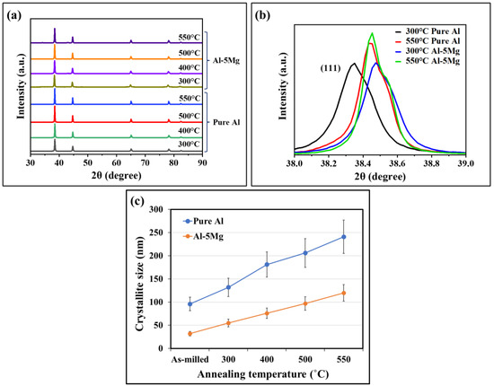 XRD results for 8 h cryomilled pure Al and AL-5% Mg annealed powders showing (a) the variation in XRD plots, (b) the shrinkage of the (111) peaks, and (c) the increase in crystallite size with increasing annealing temperature.