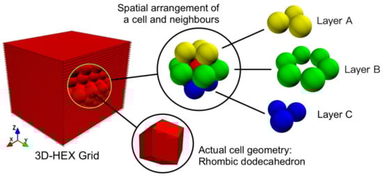Schematic view of 3D-HEX grid and spatial arrangement of a cell and its neighbors.