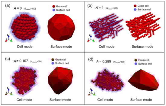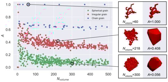 Figure 5 reveals that most spherical grains have A values between 0 and 0.2 (green dots), and most irregular grains have A values between 0.3 and 0.6 (red dots). This agrees with the expected behavior of MC methods, confirming that A can capture the degree of sphericity quantitatively. Note that we use transition rules based on equiaxed grain formation rather than dendrite formation for MC methods in this paper, which results in more low-A grains. However, since chain-like grains have a similar morphology to dendrites and since they always have high A values (blue dots), we can infer that A is also effective for dendrites.