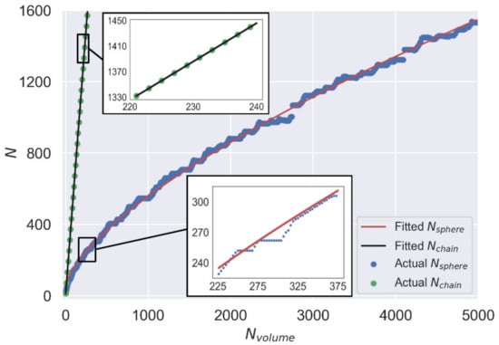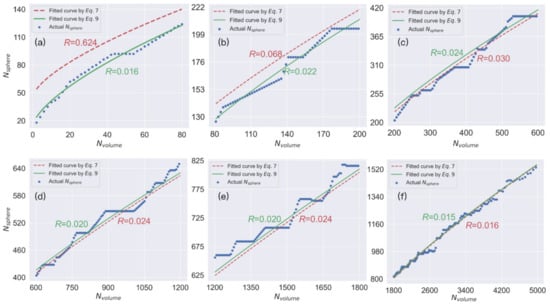 Figure 3 shows that Nchain and Nvolume have a linear relationship in the chain model, implying that each Nvolume adds six units of surface area. In contrast, Nsphere has a more complex relationship with Nvolume in the sphere model, which can be approximated by Equation (7). To assess the quality of this approximation, we use residual analysis (Equation (8)), where R is the average residual, and a good fit is expected to have R < 0.05 []. Ni and are the actual and fitted values of Nsphere when Nvolume = i. However, Equation (7) has a high R value of 0.115, indicating a poor fit, especially when Nvolume < 200 (see red dotted curves in Figure 4a,b).