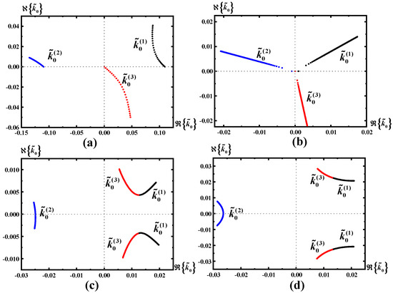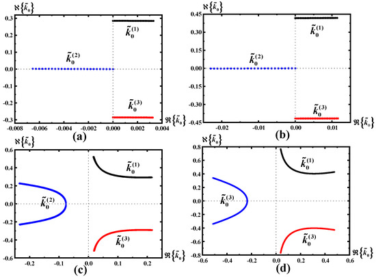 Figure 3. Figures showing the local dispersion relationship for typical cases of and , () with , , , ,, , , , . (a) Typical dispersion curves for the , with the real eigenvalues . (b) Typical dispersion curves for the , with the real eigenvalues . (c) Typical dispersion curves for the , with the complex eigenvalues , where . (d) Typical dispersion curves for the , with the complex eigenvalues , where . In the figures, the black line describes , the red line describes , the blue line describes , is the real part of and is the imaginary part of .