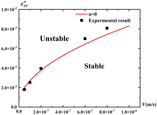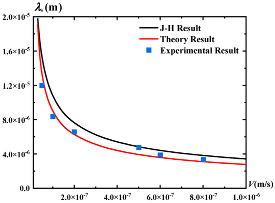 From Figure 4, we have obtained the stable growth region of the SCN-DC rod eutectic, which is close to the experimental data for the steady growth of the SCN-DC rod eutectic [25]; for example, when and , we say that the rod eutectic growth is stable. Next, we combined the obtained with and predicted the relationship between the critical stable eutectic spacing of the material (SCN-DC) and the velocity under the conditions that the velocity is greater than and where in, then compared it with the theoretical values predicted by J–H [25] and some experimental data [25]; the results are shown in Figure 5.