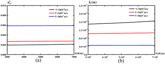 It can be seen from Figure 6 that the critical small parameter and the critical eutectic spacing are less affected by the temperature gradient where , ,. Only when the velocity is relatively small, that is, when or , the critical small parameter and the critical eutectic spacing are slightly affected by the temperature gradient and increase with the increase in the temperature gradient, but their changes are not obvious. When the velocity is relatively large, that is, when , the critical parameters and the critical eutectic spacing almost do not change with the change in the temperature gradient.