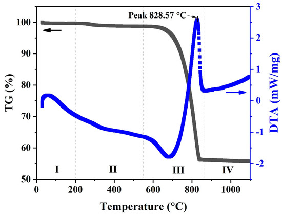 TG and DTA testing were conducted for samples taken from the uncalcined (natural) powder from the waste cockle shells. The TG/DTA curve for the uncalcined CS powder is shown in Figure 2. The expected thermal behavior was clearly visible, with four distinct stages of weight loss. There was a clear difference in the TG curves. In the first stage (I), small weight loss was observed at temperatures below 200 °C. This can be ascribed to the sample’s moisture content and corresponds to a broad endothermic peak in the DTA result. In the second stage (II), at temperatures between 200 °C and 550 °C, the weight of samples decreased slightly by 1–2%, which is related to the dehydration of water from the carbonate lattice and transformation of aragonite to calcite phases [22,23,24,25]. The third state (III) was observed between 550 °C and 850 °C. The weight decreased rapidly until the samples had lost 43% of their weight and were subjected to differential thermal analysis at 828.57 °C. This state is a release process of carbon dioxide (CO2) as a result of calcium carbonate decomposing a fraction of the sample into calcium oxide [24,25]. The final state (IV) was observed at a temperature above 850 °C. The weight of the sample remained almost constant.