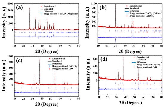 Fitted XRD patterns of the CS: (a) uncalcined and calcined CS powder at (b) 700 °C, (c) 900 °C and (d) 950 °C by the Rietveld refinement technique.