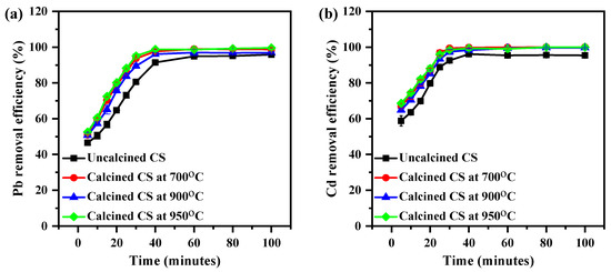 Figure 6b shows a similar trend for the Cd removal percentage of CS. It was noticed that when the time was increased from 5 to 30 min, the Cd removal rate increased from 58.8 ± 2.8% to 96.1 ± 0.5%, 66.9 ± 0.8% to 99.8 ± 0.3%, 64.8 ± 0.9% to 98.3 ± 0.7%, and 68.6 ± 0.8% to 99.3 ± 0.9% for uncalcined and calcined CS at 700, 900, and 950 °C, respectively. An explanation for this behavior is that all the sites on the surface of the calcined CS are vacant at the initial stage. However, with increasing contact time, there was a progressive increase in the number of bonds in active sites on the calcined CS surface which underwent an adsorption interaction with metal ions. The heavy metal became less efficient [30,31,32].