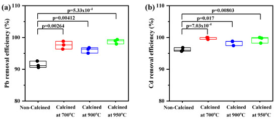 The calcination treatment’s effect on the adsorption of Pb and Cd is presented in Figure 7. There were no statistically significant differences in the Pb removal efficiency when comparing the uncalcined CS at different temperatures; however, significant differences were observed between the uncalcined and calcined CS at 700 °C (p = 0.00264), (c) 900 °C (p = 0.00412), and (d) 950 °C (p = 5.33 × 10−4) (Figure 7a).