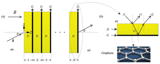 A side view of the proposed absorber model is shown in Figure 1a. The model can be described as , where D represents a nonmagnetic lossless dielectric (yellow), G represents graphene (black), and N represents the period number. The dielectric D and graphene G, with thicknesses of and and relative permittivities of and , are parallel to the x-y plane. The SBMF B is perpendicular to the graphene plane, so the surface conductivity of graphene can be described as a tensor that has not only diagonal terms (), but also off-diagonal terms (). In the THz frequency range, the surface conductivity of highly doped graphene is often expressed by the Drude model. Specifically, and are, respectively, expressed as [35]