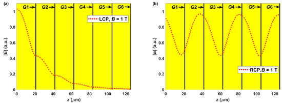To further understand the mechanism of perfect absorption for the LCP wave, the electric field amplitude distributions of the LCP and RCP waves are shown in Figure 3. The electric field of the LCP wave gradually decays and approaches zero at , while the RCP wave propagates through without attenuation. Therefore, only the LCP wave is perfectly absorbed.
