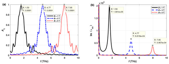 The absorption peak frequency for the LCP wave can be tuned by varying the SBMF B, as shown in Figure 4a. The peak frequency of is blueshifted while the peak value remains unchanged (i.e., at 1.59, 4.77, and 7.95 THz) as B increases. To explain the mechanism of magnetic tuning of the absorption peak frequency, the imaginary part of the relative permittivity -component of graphene (i.e., Im()) for B = 1, 3, and 5 T is plotted in Figure 4b. The peak frequency of Im() coincides with the absorption peak frequency in Figure 4a. Due to the presence of absorption and the lossless nature of the dielectric D, graphene must be lossy. Furthermore, Im() is usually used to represent ohmic loss [31]. Therefore, the maximum loss can occur at the peak frequency of Im(), and then, the optimal absorption can also be achieved. In addition, it can be seen from Figure 4a that the peak frequencies of 4.77 and 7.95 THz are three and five times the peak frequency of 1.59 THz, respectively, and these increases are equal to the increases in the tuned B. This occurs because is set to be the cyclotron frequency at T, which is linearly related to B. Therefore, peak frequency magnetic tuning of can be realized for .
