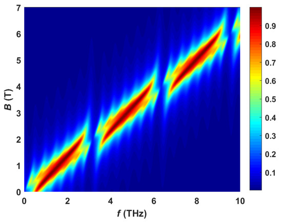 The peak frequency of for with varying B is shown in Figure 5. Three frequency bands of the absorption peak with appear in the investigated frequency range, which can be illustrated by the following formula: