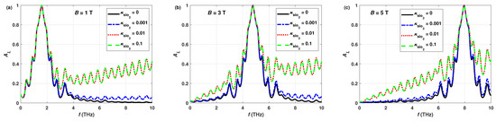Previous studies have discussed the magnetically tunable absorption performance of materials with the nonmagnetic dielectric SiO as a lossless medium (i.e., extinction coefficient ). However, in practical manufacturing, SiO has losses, and it is crucial to investigate the influence of its losses on the magnetically tunable absorption performance. The absorption of the proposed model () with different extinction coefficients is shown in Figure 7 for B = 1, 3, and 5 T. It can be seen from the figure that the loss of SiO has almost no influence on the magnetically tunable absorption performance when . However, when , although the influence of SiO loss on the absorption performance at the centre frequency is relatively small, it significantly affects the absorption performance outside the 1 THz bandwidth around the centre frequency. Therefore, in practical manufacturing, a nonmagnetic dielectric SiO with an extinction coefficient should be selected to achieve more stable magnetically tunable absorption performance.
