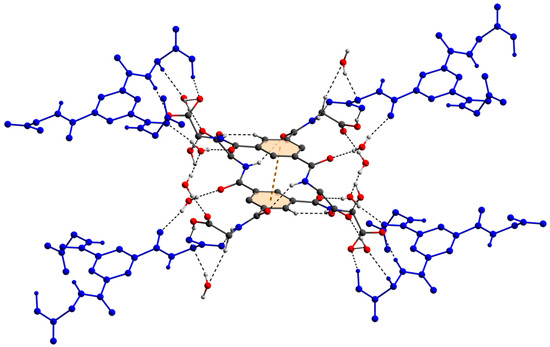 However, the distance of the hydrogen atom H21 of the Cg3 centroid of the phenanthroline 1 and the centroid Cg1 of the dianion (Figure S4) of 3.3033 (1) Å indicate rather an attractive interaction of the positively charged C-bounded hydrogen atom and the aromatic system and thus a C–H∙∙∙π interaction. This is supported by a comparison of the distance of the centroids Cg1 and Cg3 with a distance of 4.4404 (2) Å, which is no longer in the usual range of distances of π–π interactions. The observed geometry of the C–H∙∙∙π interactions is in good agreement with the literature values [36,74]. The pairwise energy calculations based on SAPT of the PSI4 program package [62] show the largest energy gain in the interaction of phenanthroline 1 and the dianion. The pairwise interaction energy calculation results for the phenanthrolines and the phenanthrolines with the dianion can be found in Table S4 of the SI.