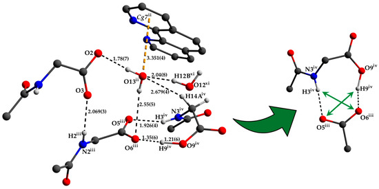 Detailed view of the anion connection via hydrogen bonding and the environment of the O13 water molecule with lone-pair∙∙∙π interaction (left) as well as the attractive secondary electrostatic interactions (right). The hydrogen atoms which are not involved in hydrogen bonding have been omitted for clarity. Bond lengths are given in Å. Symmetry codes: (ii) −x + 1/2, y + 1/2, z; (iii) −x, −y + 1, −z + 1; (iv) x − 1/2, −y + 3/2, −z + 1; (xi) −x + 1, y, z (see Tables S1–S3 for details).