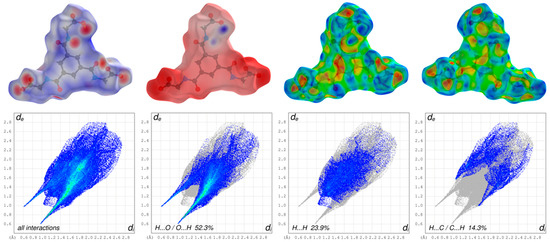 - Spackman, M.A.; McKinnon, J.J.; Jayatilaka, D. Electrostatic potentials mapped on Hirshfeld surfaces provide direct insight into intermolecular interactions in crystals. CrystEngComm 2008, 10, 377–388. [Google Scholar] [CrossRef]