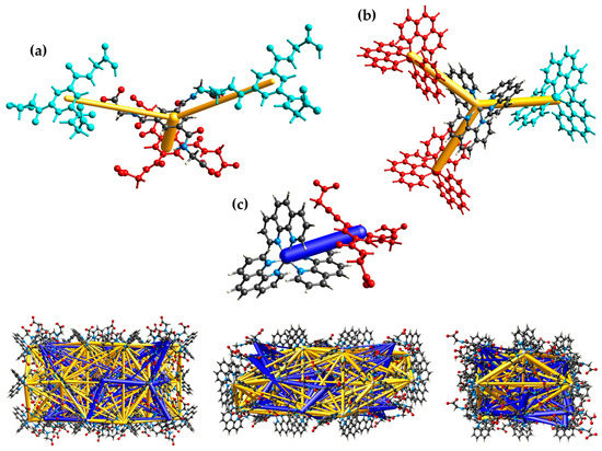 Visualization of the pairwise interaction energies (gold and blue bars) between the anions (a), the complex cations (b), anion and cation (c) with color code as well as the energy framework in the crystal (bottom) along the a axis (left), b axis (middle) and c axis (right).