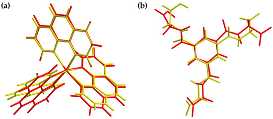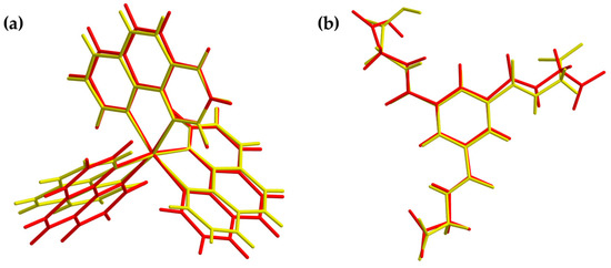 Overlay view of the structures in the crystal (yellow) and optimized structures (red) of the cationic complex (a) and the dianion (b). Optimization based on BP86/def2-TZVP (cation) and UKS BP86/ma-def2-TZVP (anion) level of theory, respectively.