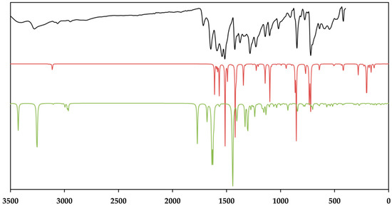 For all the theoretical calculations, the density functional programs provided by the ORCA 4.0.1. [53] package was used. Before the spectra were calculated, the structures were optimized to avoid a convergence to a saddle-point leading to negative frequencies. The optimization results are presented in Figure 8 and Figure 10 wherein the original structures of the cationic complex and dianion based on the crystal structure coordinates are colored in yellow, and the optimized structures were colored in red. All calculations were carried out using the pure density, local, and gradient corrected functionals of Becke and Perdew, which is known as BP86 [76] and provide excellent geometries and vibrational spectra in most cases. The def2 basis sets of the Karlsruhe group of TZVPP and TZVP [77] were employed for the infrared and Raman spectra calculations, and the def2/J auxiliary basis [78], including the RI approximation, was used for the coulomb fitting, respectively, featuring a valence triple-zeta basis set with polarization functions on all atoms. For the unrestricted theoretical calculations of the anion spectra, the diffuse and minimally augmented basis sets were used [79]. The resulting theoretical spectra are compared with the measured ones as depicted in Figure 9 and Figure 11, wherein the lines of the theoretical spectra of the cationic complexes are colored in red and the lines of the dianion are colored in green. The room temperature baseline-corrected FT–MIR spectrum was measured in the range of 3600 and 400 cm−1, and the Raman spectrum was measured in the range of 3600 and 0 cm−1, respectively. The lines of the measured spectra are colored in black.