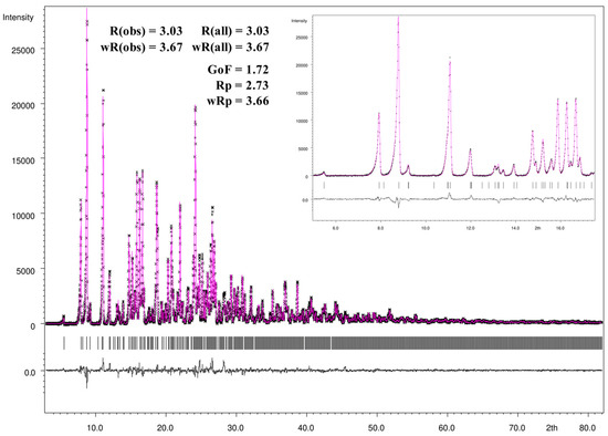 The phase purity of the crystalline powder probes of the newly synthesized compound were confirmed by powder diffraction techniques before all other measurements were carried out. PXRD data were collected on a STOE STADI P X-ray powder diffractometer in the Debye–Scherrer geometry with a position-sensitive detector and a germanium monochromated Cu-Kα radiation (λ = 1.54056 Å) at room temperature. Standard measurements were carried out with a generator voltage of 40 kV and a current of 30 mA and a two theta step size of 0.01° with a step width of 0.7° over an angular range of 3–91°. A measuring time of 50 s for each step leads to a total time of two hours for a single range. Eight ranges were measured and added to lower the background noise. Data were collected, analyzied, and visualized with the Stoe WINXPOW software, and the JANA2006 program package [52] was used for the leBail and Rietveld refinement procedure.