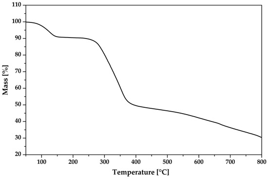 The thermogravimetric analysis was performed using a TGA951 from TA Instruments Inc. The temperature range for the TGA measurements was from room temperature to 920 °C, with a heating rate of 10 K/min. The samples weighed 4.4090 mg and were measured in a platinum crucible under an argon atmosphere with a flow rate of 50 mL/min. For the elemental analysis, approximately 2 mg of the solid sample were weighed into a thin-walled tin boat, enclosed, and introduced into the Vario EL elemental analyzer from Elementar Analysesysteme GmbH.