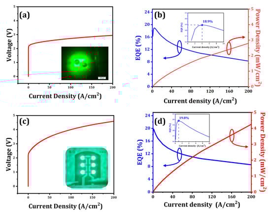 The optical and electrical performance of μ-LEDs devices under direct current was measured using a spectrometer (Maya 2000 Pro), where the emitted light was collected by an integrating sphere. Figure 1 summarizes the electric performance of the 50 μm × 6 μ-LED array with a three-layer staggered quantum well structure compared to that of a commercial 170 μm × 107 μm × 3 μ-LED array. The detailed fabrication process of the 50 μm × 6 μ-LED array in this work can be found in our previous research []. Figure 1a,c show the voltage as a function of current density for the commercial µ-LED and this work. Figure 1b,d show that the maximum EQE of the commercial µ-LED array is 18.9% before the efficiency droop at a low injection current. Moreover, the maximum EQE of the 50 μm × 6 μ-LED array is 19.8% before the efficiency droop at a low injection current. However, the efficiency droop phenomenon occurs at low current density due to the QCSE in the polar c-plane GaN. Nevertheless, this device still suffers less efficiency droop compared to commercial c-plane wafers due to the presence of a three-layer staggered quantum well structure, which improves conversion efficiency at higher injection currents []. Furthermore, the power density of the 50 μm × 6 μ-LED array in this work is also greater than that of the commercial μ-LED array.