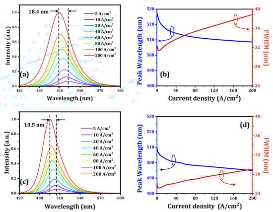 Figure 2 summarizes the optical performance of the 50 μm × 6 µ-LED array and a commercial 170 μm × 107 μm × 3 µ-LED array. Figure 2a,c show the electroluminescence (EL) emission spectra for increasing injected current from 5 A/cm2 to 200 A/cm2, showing the emission peak wavelength changing from 527 nm to 508.6 nm and 508.8 nm to 498.3 nm for the commercial µ-LED and this work, respectively, in the green spectral region. Moreover, the peak wavelength shift is 18.4 nm and 10.5 nm for the commercial and this work, respectively, as shown in Figure 2b,d. Both the wavelength shift and FWHM of this work show better performance than the commercial µ-LED due to the bandgap engineering of the staggered quantum well structure.
