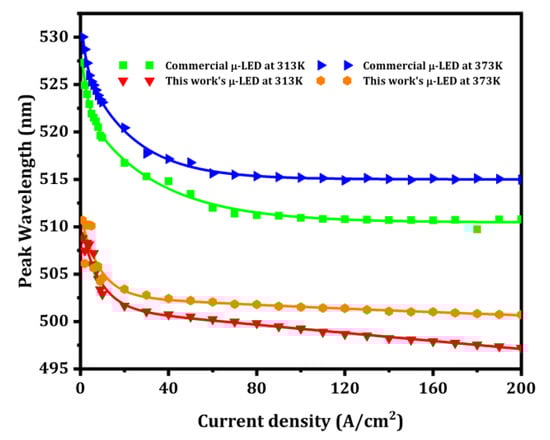 Figure 3 summarizes the temperature-dependent wavelength as a function of current density. Under the same current density, the wavelengths of both μ-LEDs exhibit a red shift as the temperature increases. At 200 A/cm2, the redshift is 4.18 nm and 3.52 nm from 313 K to 373 K for the commercial μ-LED and the μ-LED from this work, respectively. The red shift in the wavelength is primarily caused by bandgap shrinkage due to heating [,]. Furthermore, the difference in redshift may be attributed to the thermal resistance of the μ-LEDs, which is caused by variations in the epitaxial structure and packaging.
