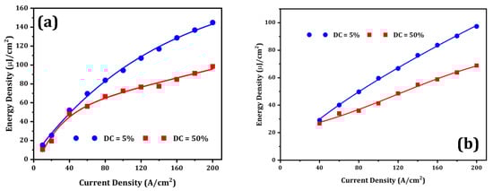 To further investigate the effect of self-heating in μ-LEDs more thoroughly, the optical performance of both commercial μ-LEDs and μ-LEDs from this study was measured under different duty cycles (DC). The μ-LEDs were driven by a pulse current source (LDP-3811) with a pulse width of 100 μs at duty cycles of 5% and 50%. The emitted light was then collected by a photodiode energy meter (PD10-C). The results are illustrated in Figure 4. Under pulse mode operation at the same current density, the results reveal that both the commercial μ-LEDs and the μ-LEDs from this work exhibit superior energy density at a duty cycle of 5% compared to a duty cycle of 50%, due to more effective thermal management, reduced thermal stress, resulting in improved efficiency, higher peak power, and decreased device degradation [,,]. This emphasizes the importance of carefully selecting the appropriate duty cycle for pulse mode operation to maximize energy density and minimize self-heating, ultimately enhancing the performance and longevity of LED devices across various applications.