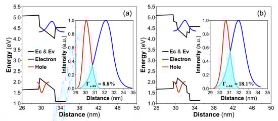 An enhancement of the internal quantum efficiency (IQE) can be achieved by increasing the radiative recombination rate. The recombination rate Wspontaneous can be expressed as follows: [], where and are the Bloch envelope functions for the conduction and valence bands, respectively, and is the electron and hole wavefunction overlap integral. The energy band diagrams and the wavefunction overlaps of the regular and staggered quantum wells at the input current equal to 300 mA are shown in Figure 6. In Figure 6a, the regular InGaN quantum well displays a large spatial separation between electron and hole wavefunction due to an internal electric field, with the electron-hole wavefunction overlap Γe-hh = 8.8%. In Figure 6b, a three-layer staggered InGaN quantum well is shown, where a higher indium content sublayer in the center, sandwiched between two sublayers with lower indium content, draws both electron and hole wavefunctions to the center, resulting in the significantly improved wavefunction overlap Γe-hh = 18.1%. By optimizing the indium contents and thicknesses of the sublayers in the staggered InGaN quantum well, the electron-hole wavefunction overlap can be increased by more than two times, compared to the regular InGaN quantum well.