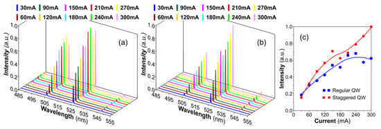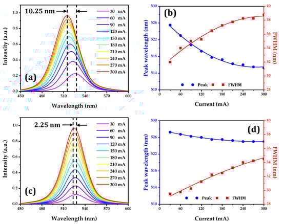 Figure 7 summarizes the optical performance of the regular and staggered quantum wells. Figure 7a,b show the electroluminescence spectra of ordinary µ-LEDs with regular MQWs. When the input current increases from 30 mA to 300 mA, the peak wavelength changes from 525.50 nm to 515.25 nm, corresponding to a blue-shift of 10.25 nm, and the FWHM increases from 32 nm to 39 nm. In contrast, Figure 7c,d show the electroluminescence spectra of µ-LEDs with staggered MQWs. When the input current increases from 30 mA to 300 mA, the peak wavelength has a relatively small blue-shift from 527.25 nm to 525.00 nm and the FWHM increases from 29.5 nm to 34.5 nm. Here the broad FWHM of 34.5 nm is problematic for color purity, as high color purity is accompanied by narrow FWHM. Both the commercial and staggered quantum well µ-LEDs show better performance than the ones demonstrated in Section 3 due to the presence of the NP DBR as the strain-released layer, which mitigates the effect of the QCSE.