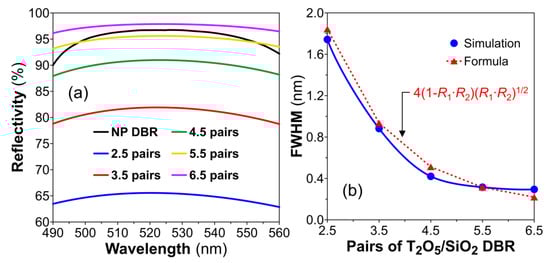 (a) Reflectivity spectra of the top reflective mirror with different pairs of Ta2O5/SiO2 DBRs. The optical reflectivity of 11.5 pairs of GaN/NP-n-GaN DBR was plotted by the black line. (b) FWHMs with different numbers of Ta2O5/SiO2 DBR pairs.