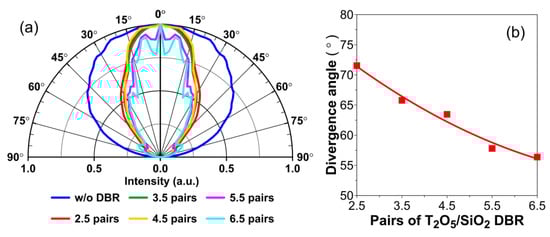 We have also investigated the far-field emission patterns of the µ-RCLED with staggered MQWs for increasing numbers of Ta2O5/SiO2 DBR pairs from 2.5 to 6.5, as shown in Figure 10. The calculated radiation profiles for different pairs of Ta2O5/SiO2 DBRs are all narrower than the Lambertian-like distribution of conventional LEDs, as plotted by the blue line in Figure 10a. The calculated divergence angle decreases from 71.5° to 56.4° as the number of Ta2O5/SiO2 DBR pairs increases from 2.5 to 6.5, as shown in Figure 10b. The angular color shifts within ±30° are achieved to improve the light extraction efficiency when the number of DBR pairs is equal to or larger than 5.5.