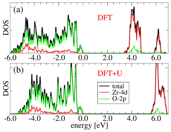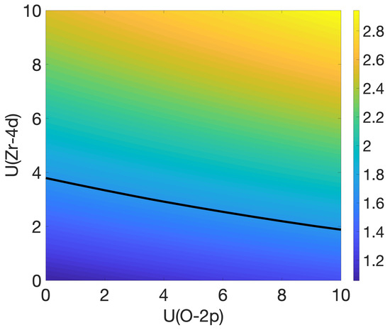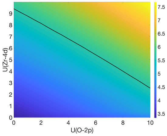 The ambiguity of the choice of U which is manifest in Figure 2 can be resolved in various ways. One possibility is to simply choose a second property to be fitted. Such an approach would, however, still depend on the choice of properties. Nevertheless, such an empirical fitting of U is still a very common practice. A second approach, free of any such arbitrariness and more in line with the concept of a parameter-free calculation from the first principles, is to calculate the values of the Hubbard parameters. This idea was first proposed by Cococcioni and de Gironcoli [28] and was recently implemented in a different but equivalent formulation in quantum-ESPRESSO [29]. The basic procedure is to use a linear-response formalism to determine values of the parameters U. Applied to the case of c-ZrO, one finds the values U(Zr-4d) = 2.85 eV and U(O-2p) = 9.16 eV. The DOS of the system using these values is shown in panel (b) of Figure 1, where one can clearly see that the band gap is reproduced well by this non-empirical choice of the parameters. This is also evident in Figure 2, where these two values of U are close to the black line corresponding to the experimental band gap. It should be noted that such a relatively low value of U for the zirconium d-states and a high value for the oxygen p-states is quite uncommon. For example, by semi-empirically fitting these parameters to properties, the values of U(Zr-4d) = 8.0 eV and U(O-2p) = 4.35 eV have been used in Refs. [1,30] for m-ZrO. In addition, this choice of parameters lies close to the black line in Figure 2, meaning that it is a suitable choice for U to reproduce the band gap in c-ZrO.