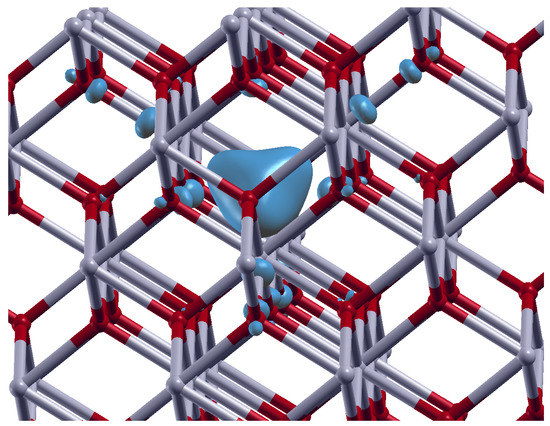 Localization of the excess electrons upon formation of an oxygen vacancy. Zr atoms are shown in grey, oxygen atoms in red. The isosurface of the excess electron density is shown in light blue and is localized mainly around the oxygen vacancy in the middle of the graph.