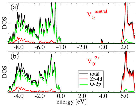 DOS for c-ZrO with an oxygen vacancy: (a) for the case of V; (b) for the case of V. The Fermi level has been set to 0 eV.