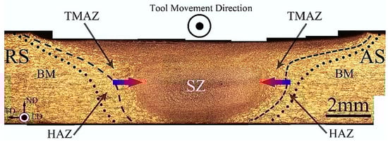 A common cross-section of FSWed joints that shows SZ, TMAZ, HAZ, and BM. Dotted and dashed lines indicate the outer boundaries of TMAZ and HAZ [29]. Reprinted under the CC BY 4.0 License.