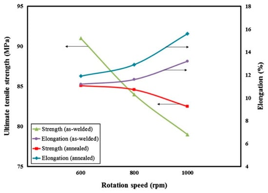 The ratio of “traverse to rotational speed”, which is called revolutionary pitch (RP), controls the heat input to the joint. A higher revolutionary pitch leads to lower heat input in the joint, whereas a lower revolutionary pitch produces higher heat input [31,94,97,98]. As shown in Figure 3, Khorrami et al. [42] indicated that increasing the rotational speed (higher heat input) led to lower tensile strength and larger elongation in defect-free FSWed joints of both work-hardened (as-welded) and annealed 1XXX pure Al alloy [42]. Additionally, an increase in ultimate tensile strength has been reported when the revolutionary pitch increases from 0.07 to 0.47 mm/rpm in the FSW of AA1050-H24 pieces [99]. Therefore, decreasing the rotational speed and increasing the traverse speed leads to an increase in the revolutionary pitch. Subsequently, the amount of heat input reduces under this condition. When the heat input is alleviated, the annealing of the work-hardened Al base is reduced. This is desirable for the strength of the defect-free welds because the softening effect caused by annealing is reduced. The mechanical properties, including tensile strength and hardness, can therefore be improved in the defect-free FSWed joints by rotational and traverse speeds [1,41,97,98].