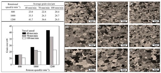 Optical microscope images and average grain size values of HAZ in FSW joint of AA3003-H18 at various rotation and travel speeds: (a) 800 r/min, 40 mm/min; (b) 800 r/min, 70 mm/min; (c) 800 r/min, 100 mm/min; (d) 1000 r/min, 40 mm/min; (e) 1000 r/min, 70 mm/min; (f) 1000 r/min, 100 mm/min; (g) 1200 r/min, 40 mm/min; (h) 1200 r/min, 70 mm/min; (i) 1200 r/min, 100 mm/min [38]. Reprinted from: Effects of heat input in friction stir welding on microstructure and mechanical properties of AA3003-H18 plates, Transactions of Nonferrous Metals Society of China 25, no. 7 (2015): 2147–2155, Abnar, B., M. Kazeminezhad, and A. H. Kokabi, Copyright 2015, with permission from Elsevier.