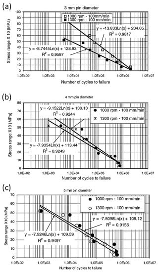 Fatigue performance of FSW lap joints was obtained with (a) 3 mm (b) 4 mm, and (c) 5 mm pin diameter and different tool rotations [43]. Reprinted from: Effects of tool rotation and pin diameter on fatigue properties of friction stir welded lap joints, The International Journal of Advanced Manufacturing Technology 36 (2008): 877–882, Kulekci, Mustafa Kemal, Aydin Şik, and Erdinç Kaluç. Copyright 2006, with permission from Springer Nature.